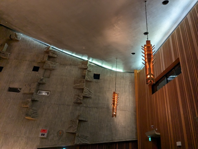 大ホールは木の温もりが感じられる造りになっていて、こちらの小ホールは、コンクリートの質感なのですが、冷たさを感じないのはユニークな形が散りばめられているからか。音が拡張していくように工夫されていて、彫刻家の流政之さんによるもの。