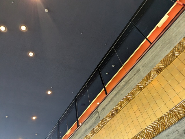 この床のタイルの色と形は、落ち葉を表しているそうです。姪と初めて東京文化会館を訪れたとき、「これ葉っぱみたい!天井のライトがお星さまみたい!ちょっと聞いてくる!」と近くにいらしたスタッフさんに駆け寄って尋ねていた。その時ににこやかに寧に「そのとおりです。この中は上野の森の中を感じられるように造られているのですよ。柱は木々を、そして、天井はおっしゃるとおり!天の川をイメージしています。」と答えてくださった。子どもには、そのまんま伝わっているのだなぁと感心したものです。